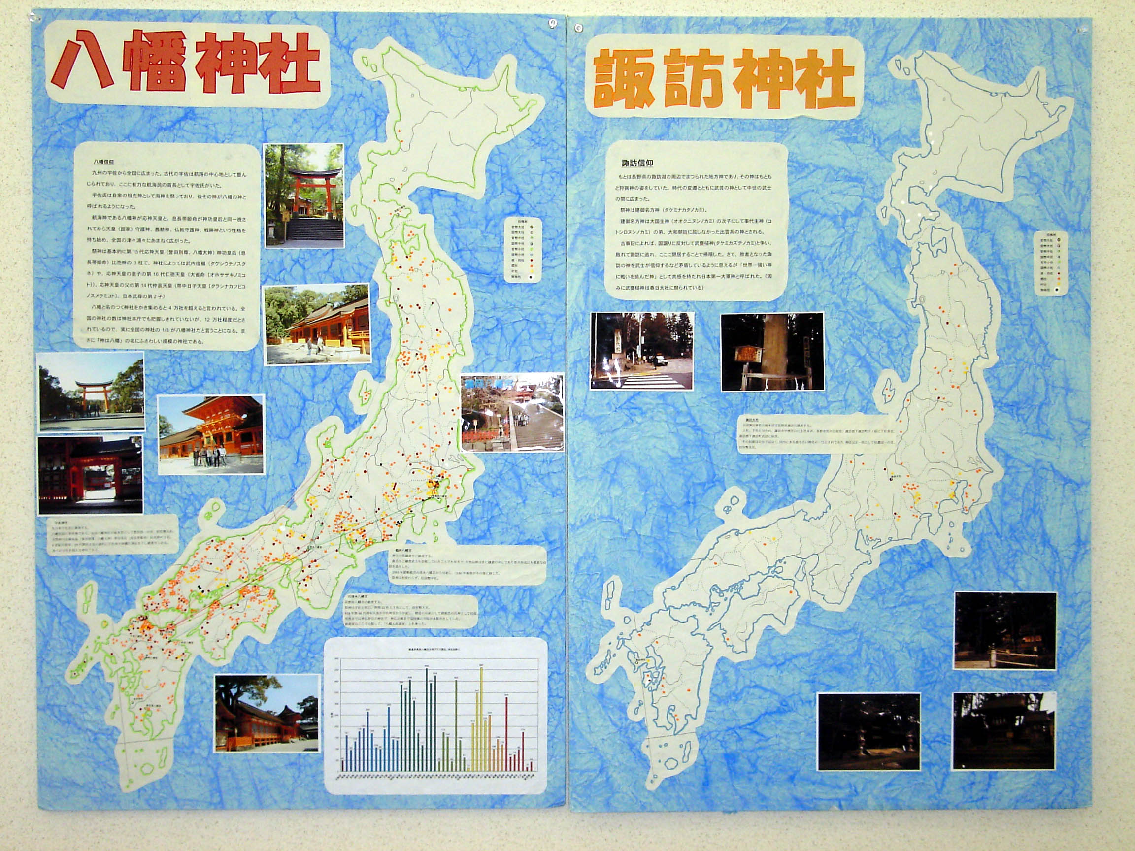 八幡神社と諏訪神社の分布と社数の差に着目した点に、高校生らしさを感じました。日本地図上に2つの神社の分布を別々に表現し、比較できるように工夫された作品です。