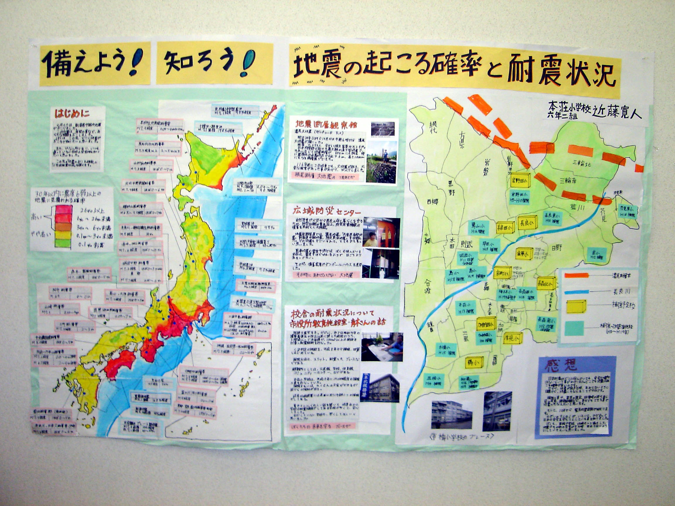 学校の耐震状況を聞き取りなどで調べ、丁寧にまとめてあります。作品作りを終えて、地震に対する心構えを自分なりに持つことができたことは、すばらしいことです。