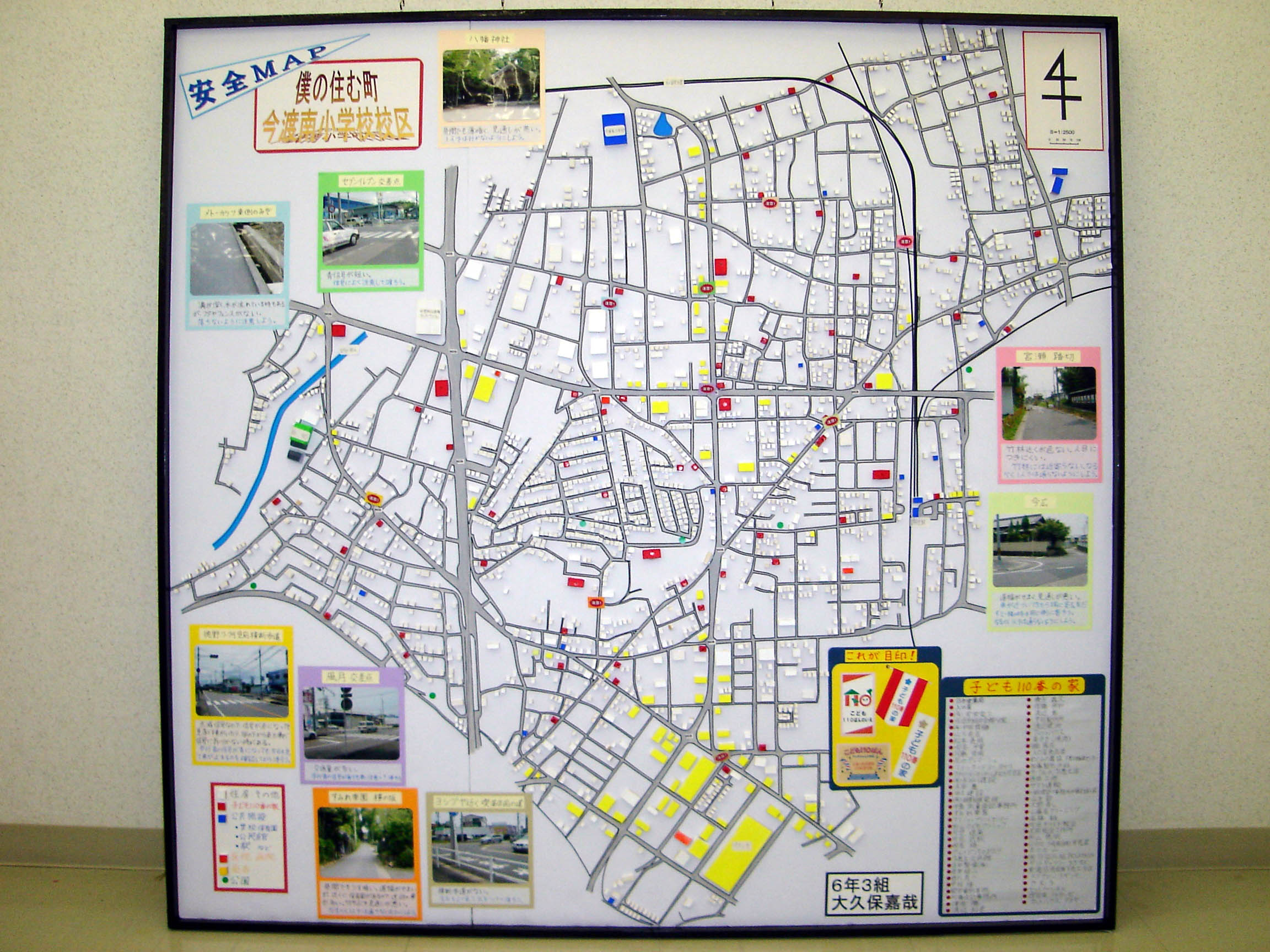 自分の校区の建物などの位置を根気よく調べ、正確に表現してあります。子ども110番の家を全て調べて、地図上に位置づけるなど「安全」というテーマがよく伝わる作品です。