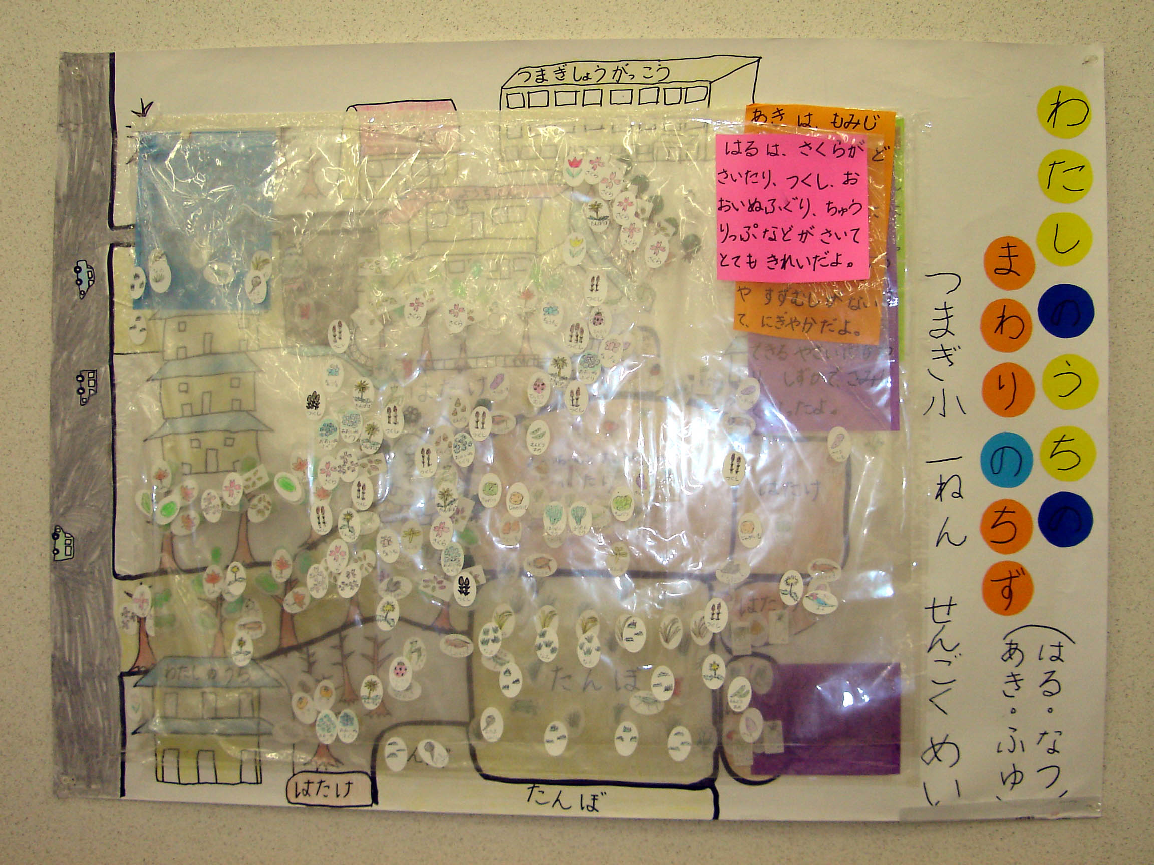 家のまわりの四季のうつりかわりを4枚のビニールシートで重ねて表現するなど工夫のある作品です。1年間を通して自然の様子を観察して仕上げたすばらしい作品です