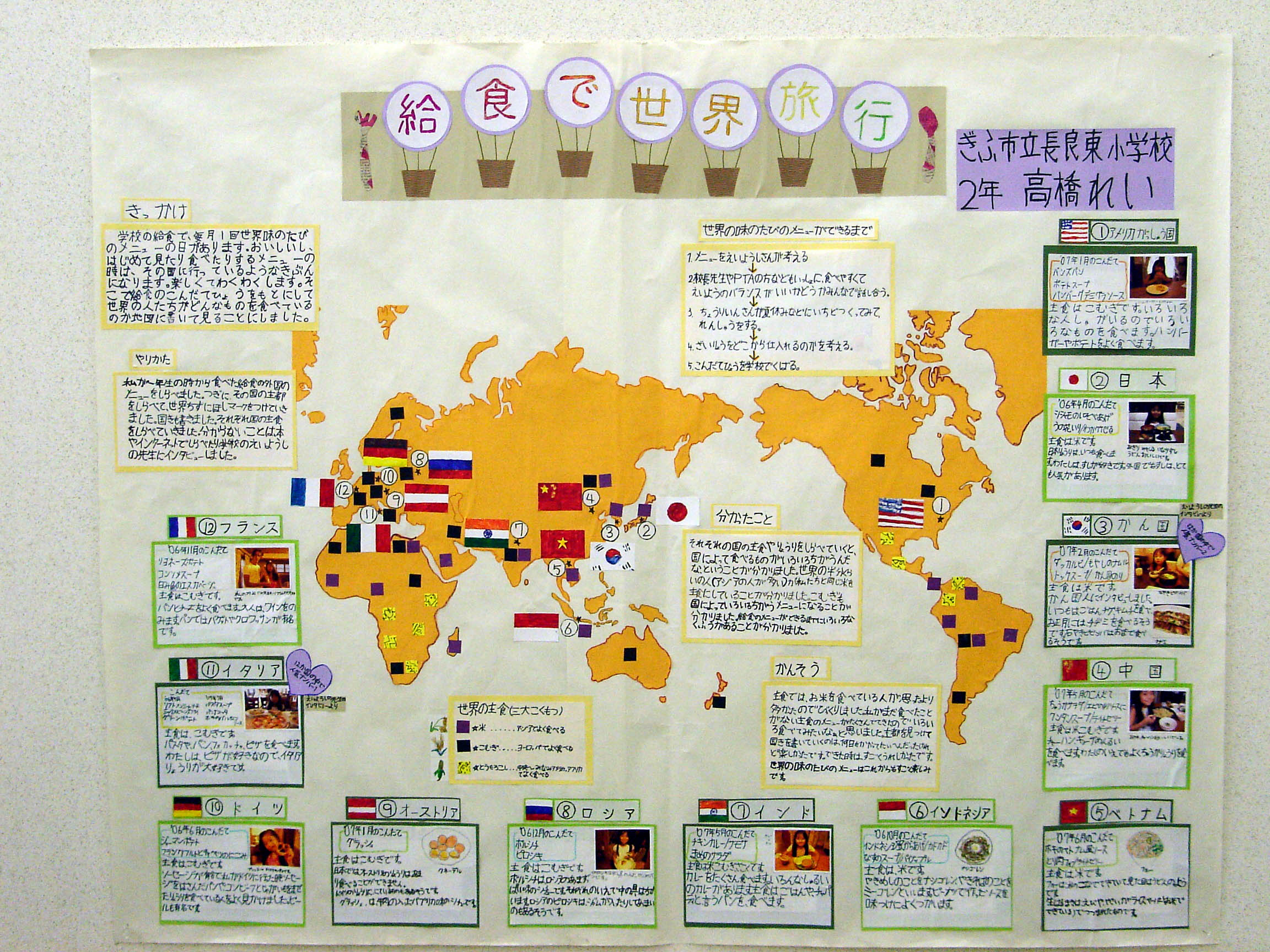 主食では、お米を食べている人が思ったより多かったのでびっくりしました。世界地図で、国の首都を見つけてしるしをつけたり、国きを書くのは、たいへんだったけれど楽しかったです。
